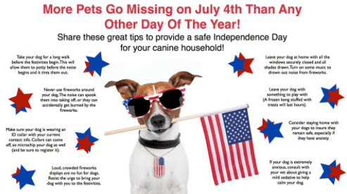 Dogs and cats, in a panic state from the exploding fireworks, may break loose from their yard and flee far from their home while becoming disoriented.