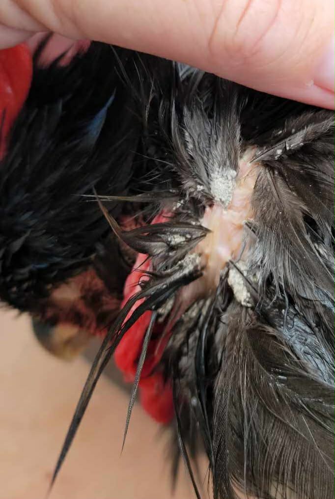 Heavy populations of the chicken body louse decrease reproductive potential in males, egg production in females, and weight gain in growing chickens. The skin irritations are also sites for secondary bacterial infections. Other species of lice are not highly pathogenic to mature birds but may be fatal to chicks. Examination of birds, particularly around the vent and under the wings, reveals eggs or moving lice on the skin or feathers.