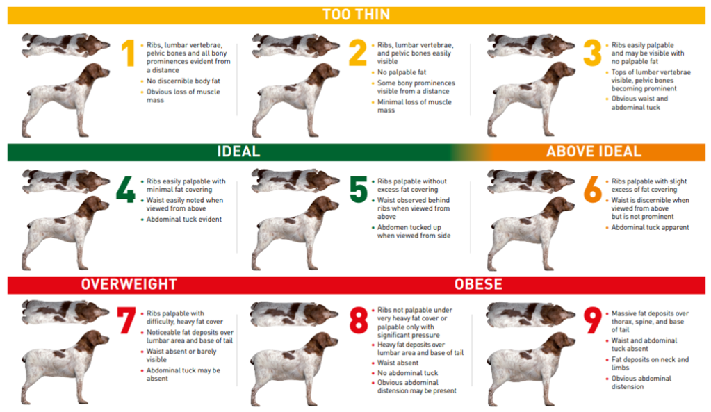 A : It is how we assess if an animal is over- or under-weight based on fat deposits and body shape. It is tailored to the individual and can be more helpful than weight. It can be very hard to give a target weight for mixed breeds ( are they more like mum or dad? ), unknown breeds and purebreds belonging to breeds with a large weight variation ( e.g. Labradors, German Shepherds ). The BCS score runs from 1 ( emaciated) to 9 ( obese ) with 4.5 being perfect, and a range of 4-5 being acceptable. Animals over 6 are at increased risk of joint disease and animals below 3.5 are at risk of muscle wastage and brittle bones. BCS charts apply to grown animals – puppies should never be put in a calorie deficit.