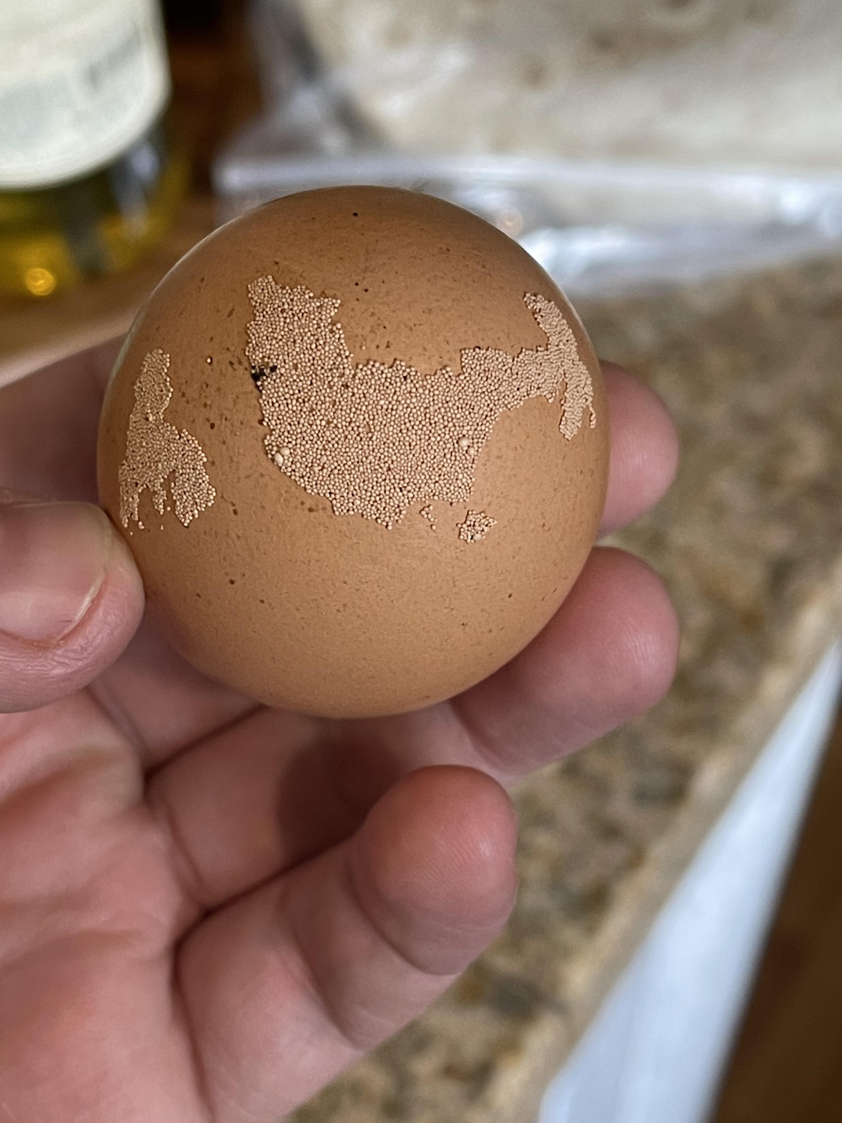 Eggs with calcium deposits will have white, irregularly shaped spots on the external surface of the shell.