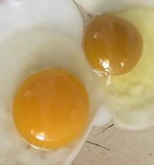 1. Multiple and double yolk: 2, 3 or more yolks within one egg. It’s caused by rapid ovulation or a reproductive cycle that is not in sync. Could be the contents of more than one egg, or twin yolks as part of a pair. Most common in young hens just starting to lay, or older hens that lay a lot fewer eggs.