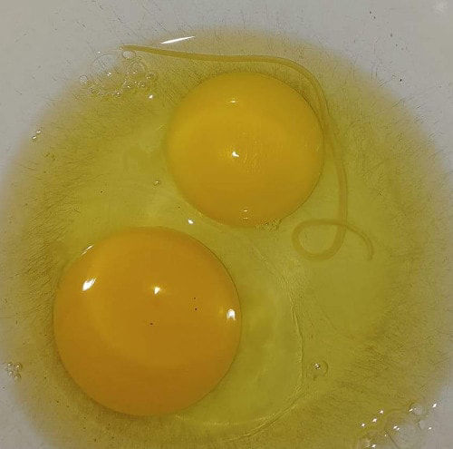 4. Worm infested eggs: a small, thin roundworm can be found in the yolk or egg white. Cause is usually a roundworm that migrated to the oviduct. It may happen in hens with a high parasite load. Doesn’t happen a lot as often hens with lots of parasites will stop laying.