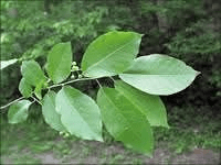 The thin leaves are dark green and shiny above, pale and dull beneath. The leaf is finely toothed with outward curved teeth. It is oval and quite broad, and narrow toward the base.
