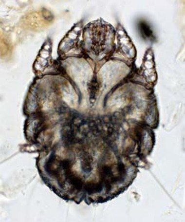 These Psorptes mites do not prefer to live on the bare crusty patches so they will migrate to the edges extending the infection outward. Skin scrapings to identify this mite needs to be made at the edges of the crusty lesions. Long standing infections can cause weight loss. Psorptes mites are identified by their long, segmented pedicles.