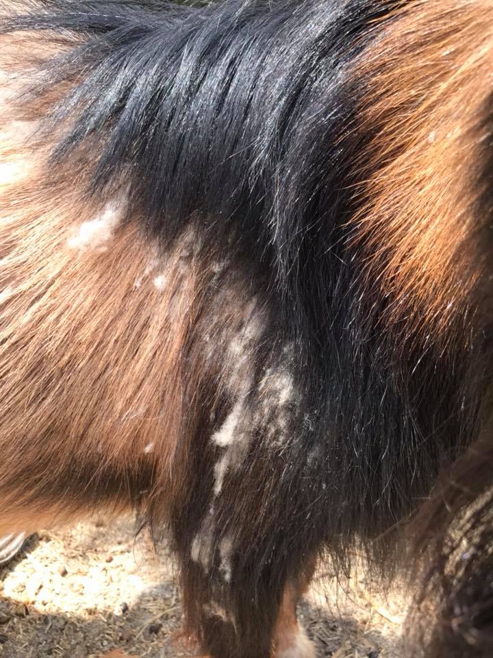 * Fungus or parasites. Skin fungi, such as ringworm, causes hair loss by breaking the hair off at the base. Parasites, like lice or mange, cause itching or irritation and goats will scratch or rub until hair loss occurs. Lice are probably the most common external parasite of goats, but mange, caused by sarcoptes scabiei, is not uncommon. Here, the mites burrow under the skin causing irritation, and the goat’s natural response is to scratch or rub against something. In some areas, insect bites can also cause hair loss as a result of trauma. Bacterial and viral infections may also cause hair loss.